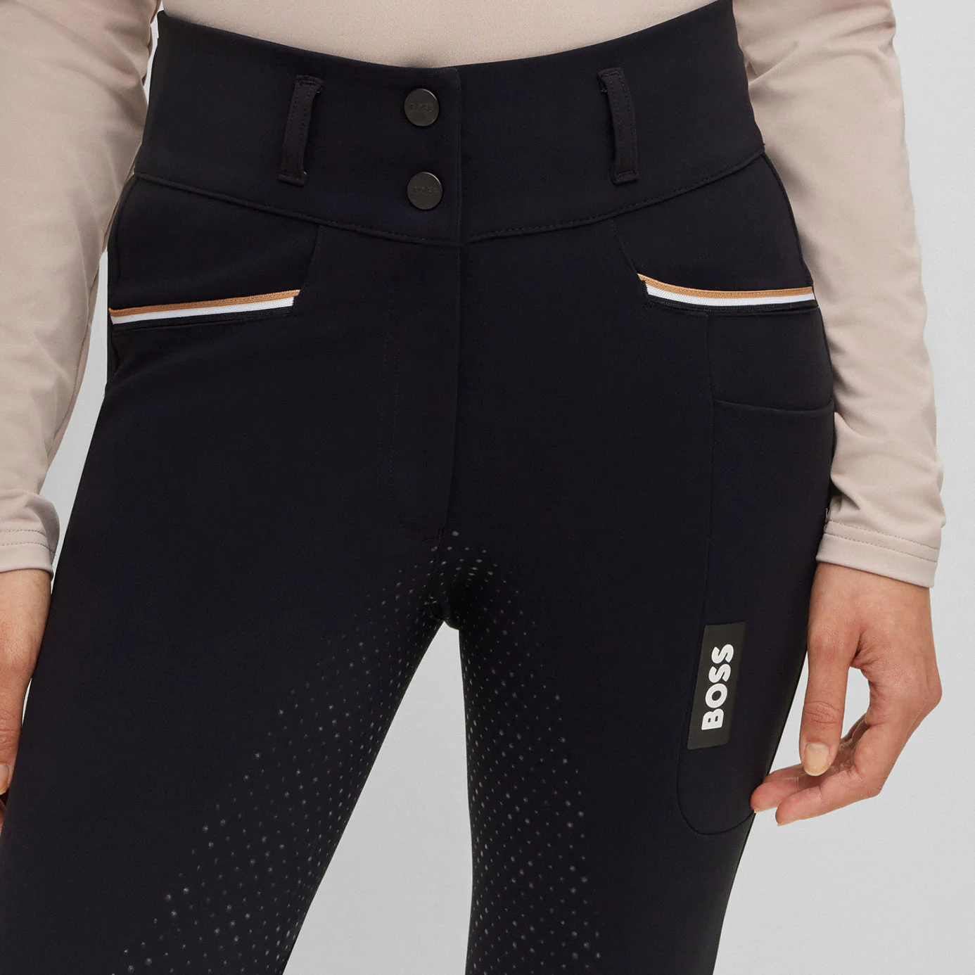 A black and white BOSS silicone logo patch on the left thigh phone pocket completes the look of these practical yet elegant riding breeches.