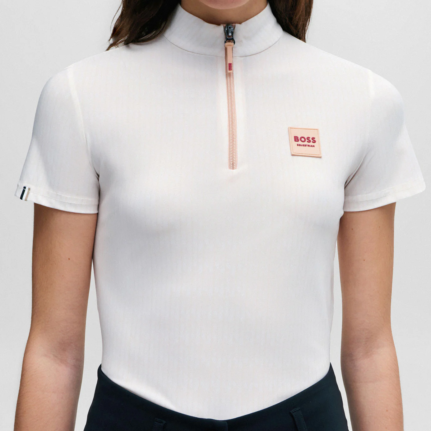 Branded detail on the zip pull and a peach BOSS Equestrian logo patch on the front left chest complete the look.